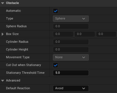 Min Avoidance Time – Can be adjusted to change how early the agents attempt to avoid a collision (shorter times mean the agents move past each other more aggressively). A default avoidance time of around 0.3s is recommended for characters, or 1s for vehicles.