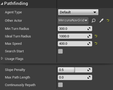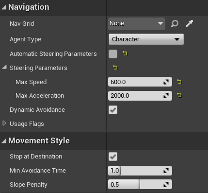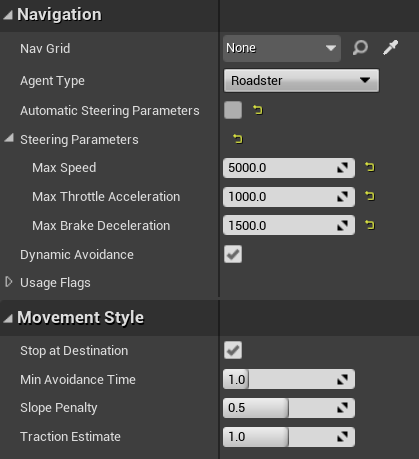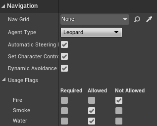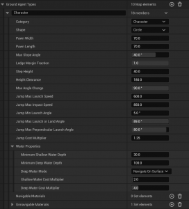 The agent category also determines the way in which the navigation component for navigating pawns can be configured, presenting options appropriate for that type of agent.