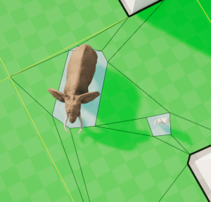 Animals prefer not to turn on the spot, so Mercuna’s kinematic pathfinder is used. This means that animals will prefer to take corners in smooth arcs even if there is a shorter route that requires a sharp turn available. However, if there is no alternative the animal is able to turn on the spot.