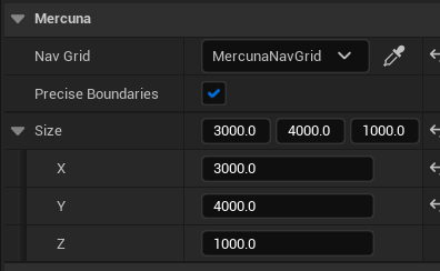 Additionally, all Nav Grid Volumes must have Precise Boundaries disabled in order to allow the associated nav grids to merge. This ensures alignment of the volumes present in each nav grid, so that whole nav grid tiles can be copied during nav grid merging.