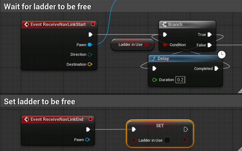 When a nav grid is loaded and ready for use the OnLoadComplete event on the Nav Grid triggers. In simple configurations where nav grids aren’t loaded from multiple sub-levels simultaneously and there is no level streaming, this event is triggered immediately after the nav grid is loaded. However, if the nav grid is merged with another nav grid when the level is loaded, then OnLoadComplete is not triggered until the merge is complete. Once the event fires, you know that pawns are able to navigate across the merged part of the nav grid.