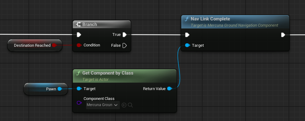 When following a path, it is possible to query a pawn’s next Nav Link using the Get Next Nav Link method on a ground navigation component. This returns whether there is a nav link in the path, how far away it is and properties of the nav link.