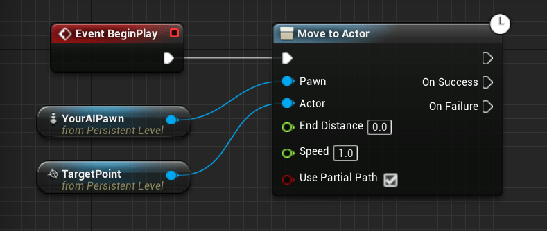 Your pawns can be ordered to move around using Blueprint commands. A simple example of using a Mercuna | 3D Navigation | Move to Actor node in the Level Blueprint to send a pawn to a target point is shown below.